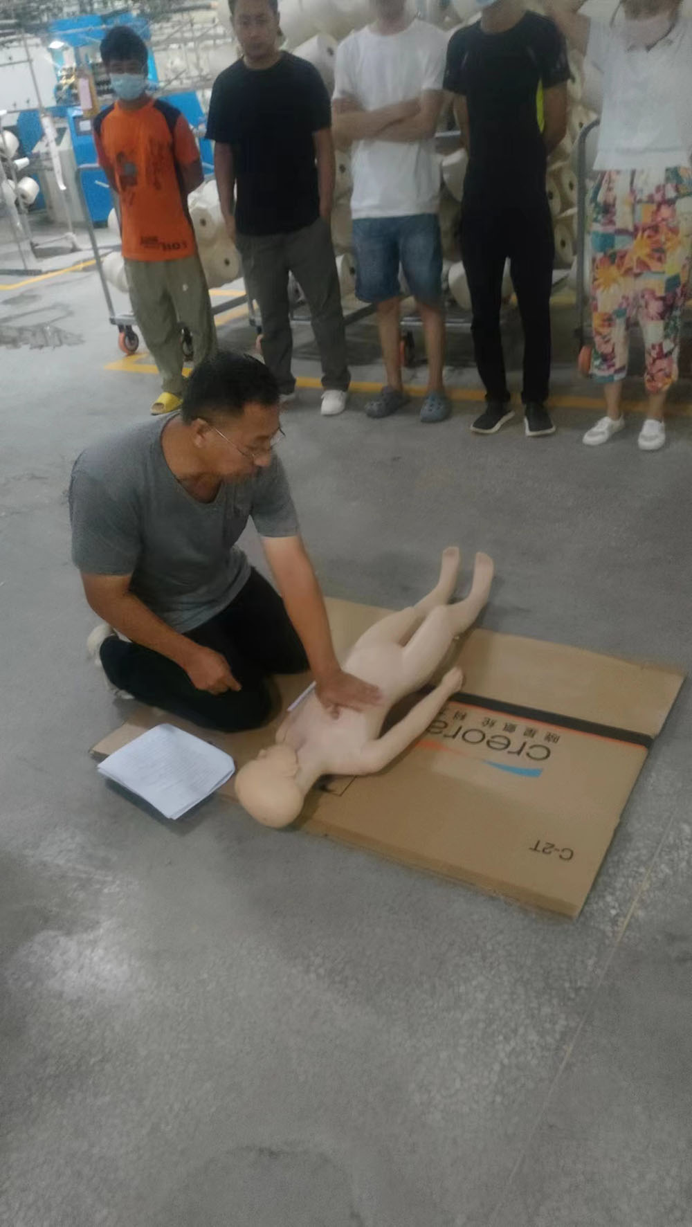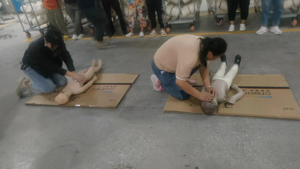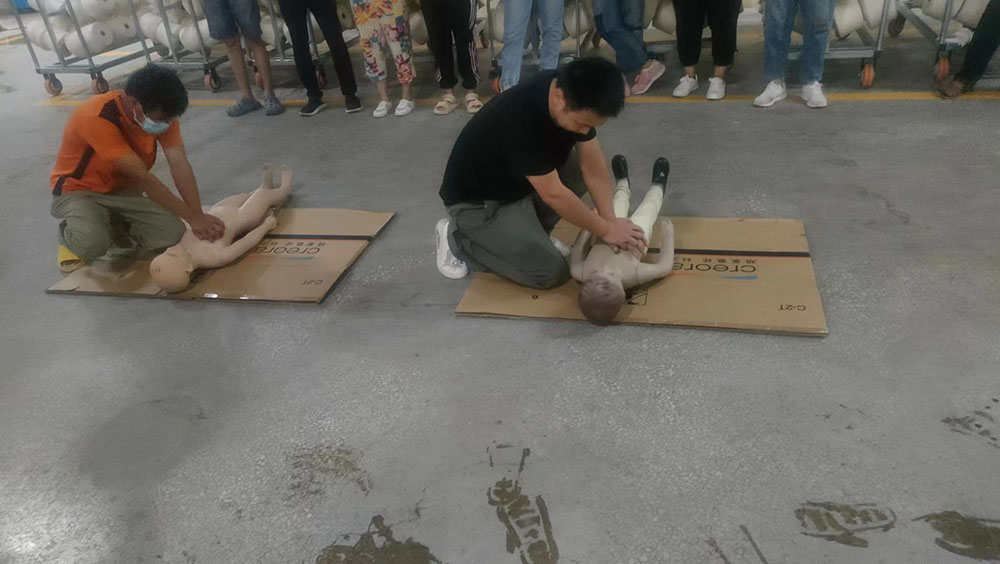 隨后,公司組織員工進行了休克、昏迷緊急救護演練,呼吸心跳驟停緊急救護演練,所有員工參加了心肺復(fù)蘇操作訓(xùn)練。