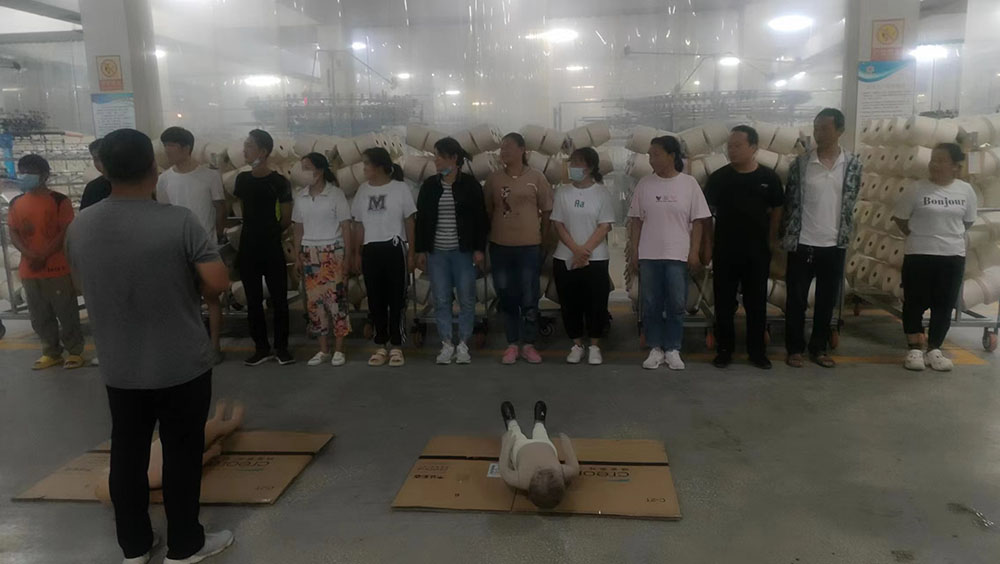 首先,模擬車間生產(chǎn)現(xiàn)場出現(xiàn)機械傷害事故,有員工被卷入大圓機中受傷,馬上啟動應(yīng)急預(yù)案。各應(yīng)急小組緊張地投入到應(yīng)急救援工作之中,搶救傷員、救護包扎、緊急聯(lián)絡(luò),各項工作有序展開。救援小組立即關(guān)停機器,將受傷員工從機器中搶救出來。救護小組給傷員檢查傷情,包扎止血。聯(lián)絡(luò)小組打120請求派救護車緊急救護,受傷員工得到了及時救治。